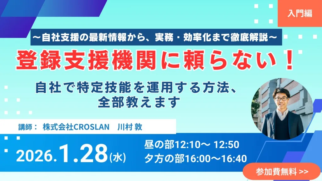 【1/28開催】【入門編】登録支援機関に頼らない!自社で特定技能を運用する方法、全部教えます 〜自社支援の最新情報から、実務・効率化まで徹底解説セミナー〜