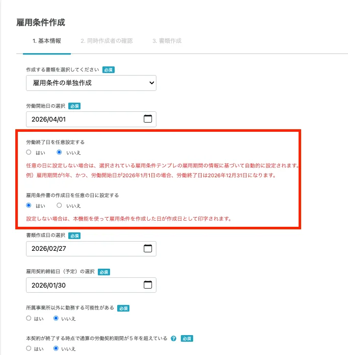 SMILEVISAの新機能のお知らせです。 雇用条件の作成機能で、労働終了日や作成日の印字を任意に設定できるようにしました。 今回のアップデートに関するご報告は以上となりますが、今後も更なる利便性向上のため、積極的に開発を進め、皆様により快適なシステムをお届けできるよう心掛けてまいります。